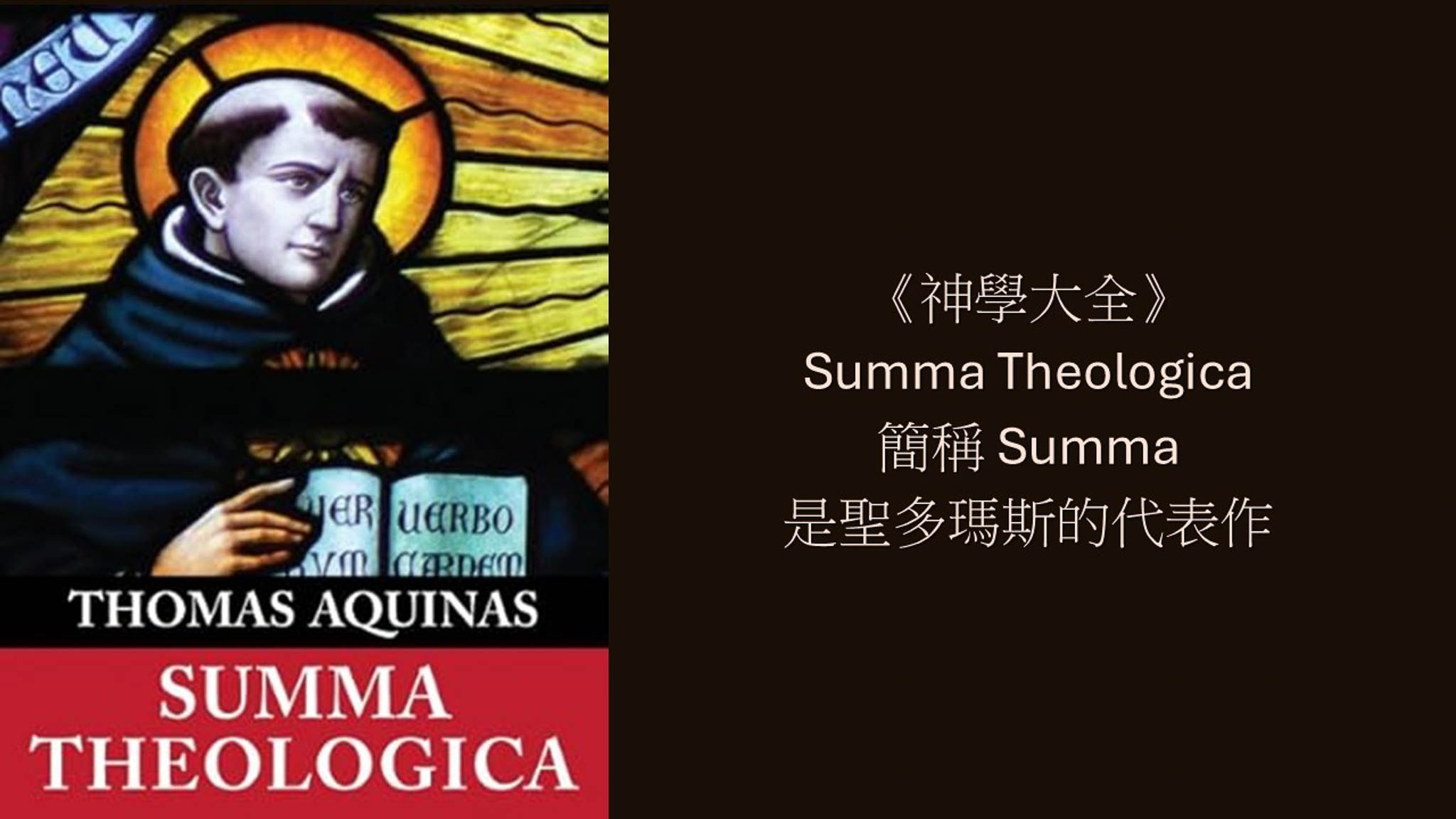 《神學大全》Summa Theologica/Summa Theologiae簡稱Summa是聖多瑪斯的代表作。原本編寫目的是作為當時編寫神學教學作品的入門手冊,總結和歸納了天主教信條背後的原理和目的。《神學大全》是聖多瑪斯平生學識大成之作,也是他最為知名和最重要的作品。