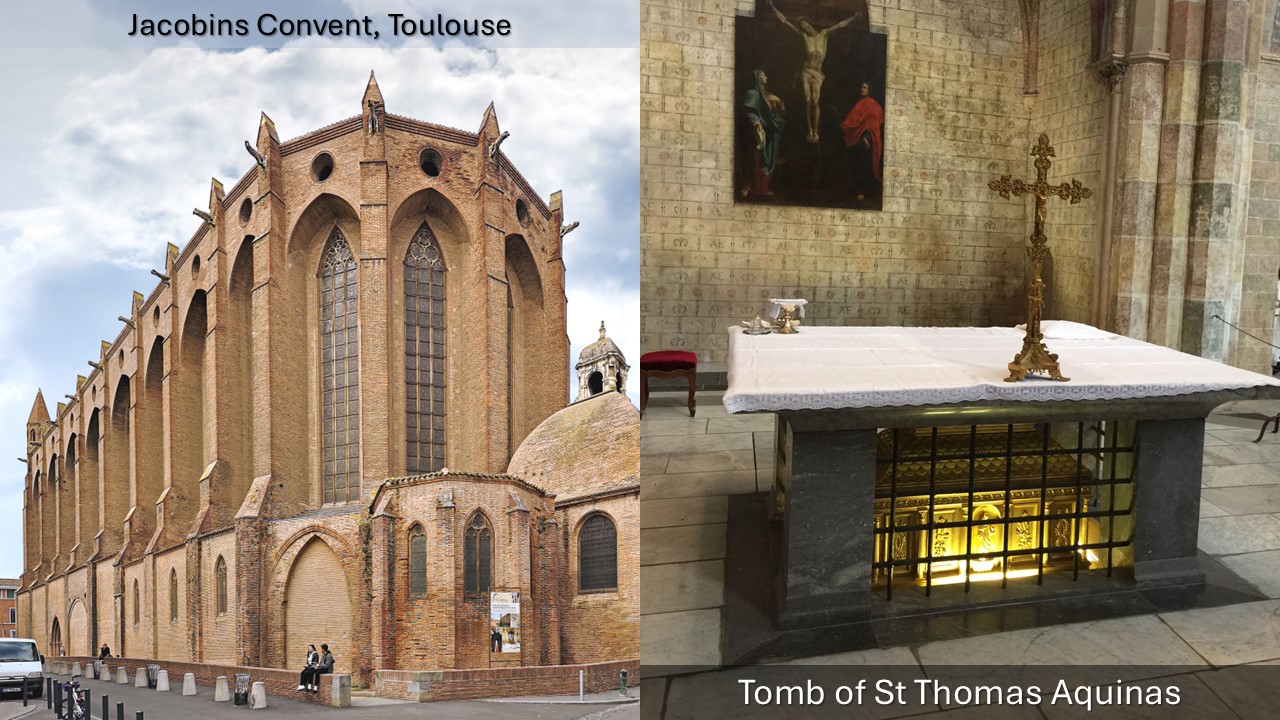 聖多瑪斯亞奎那 (St Thomas Aquinas) 是道明會的成員。 1368 年,教宗烏爾巴諾五世 (Urban V) 下令將聖多瑪斯的遺體從他去世的義大利轉移到道明會的母教堂:土魯斯雅各伯修院。聖多瑪斯的聖髑於 1369 年到達,被放置在祭壇旁的石質聖物盒中。法國大革命時期,被轉移到聖塞爾南大教堂 (Basilica of Saint-Sernin),並於 1974 年教堂完成修復後歸還給雅各伯修院。現在聖多瑪斯的聖髑在祭臺下,被安置在一個青銅聖物盒裡。