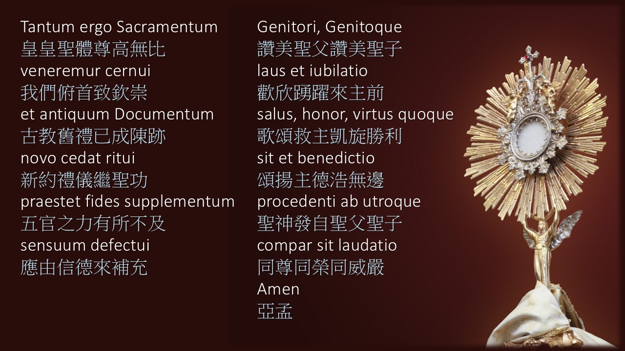 1264 年,教宗烏爾班四世 (Urban IV) 欽定耶穌聖體聖血節時,特囑托聖多瑪斯撰寫該瞻禮彌撒經文。聖人創作了一系列最美麗的讚美詩,這些都是神學與詩歌融合的傑作,至今仍在教會中使用,是我們熟悉的,包括Pange Lingua Gloriosi /Tantum Ergo Sacramentum皇皇聖體、Adoro te Devote虔誠朝拜、Panis Angelicus、O Salutaris Hostia。他的創作充盈了聖體奧跡的全部內涵,實乃千古絕唱。